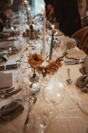 Et vakkert pyntet bryllupslokale skaper en magisk atmosfære og setter rammen for dagen. Når blomsterdekorasjonene gjenspeiler brudeparets stil og visjon, blir de mer enn bare pynt – de setter prikken over i'en og skaper minner som varer livet ut.